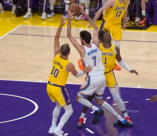 除此之外,蒂耶罗防守霍姆格伦被吹罚防守犯规,但他被对手肘击打中脸部受伤返回更衣室。湖人申请挑战成功,改判为霍姆格伦进攻犯规。